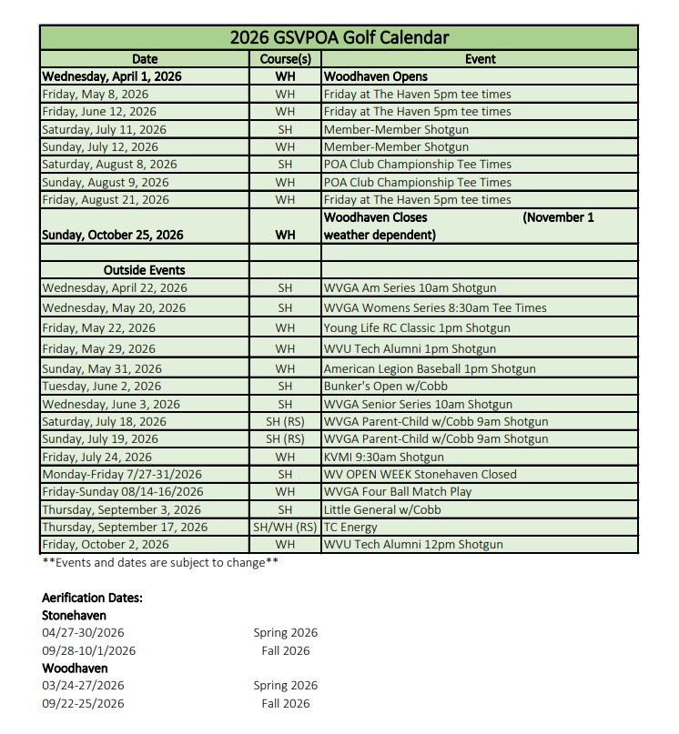 2026 GSVPOA Golf Calendar